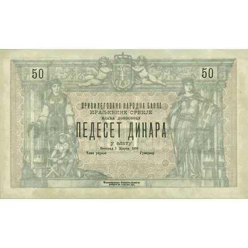 Obverse lettering ПРИВИЛЕГОВАНА НАРОДНА БАНКА КРАЉЕВИНЕ СРБИЈЕ ПЛАЋА ДОНОСИОЦУ ПЕДЕСЕТ ДИНАРА У ЗЛАТУ Београд 1 Марта 1886 Фалсификовање банкнота казни се робијом по §. 145 кр. зак.ѕ A. DOMS SC. BRUXELLES