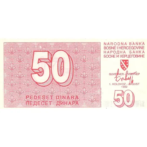 Narodna Banka Bosne i Hercegovine Pedeset Dinara (Translation: National Bank of Bosnia-Herzegovina Fifty Dinara) |