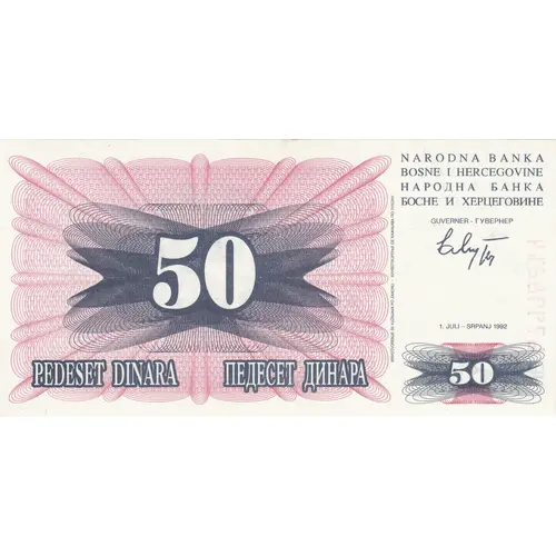 NARODNA BANKA BOSNA I HERCEGOVINE НАРОДНА БАНКА БОСНЕ И ХЕРЦЕГОВИНЕ GUVERNER - ГУВЕРНЕР 1. JULI - SRPNAJ 1992 PEDESET DINARA ПЕДЕСЕТ ДИНАРА KRIVOTVORENJE SE KAŽNJAVA PO ZAKONU - КРИВОТВОРЕЊЕ СЕ КАЖЊАВА ПО ЗАКОНУ |