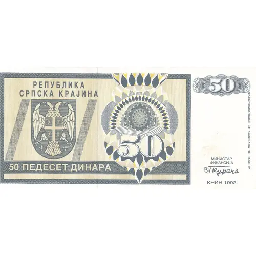 | Legenda del rovescio | 50 REPUBLIKA SRPSKA KRAJINA 50 PEDESET DINARA KNIN 1992. FALSIFIKOVANJE SE KAŽNJAVA PO ZAKONU (Translation: 50 Republic of Serbian Krajina 50 Fifty Dinara Knin 1992 Counterfeiting is punishable by law) |