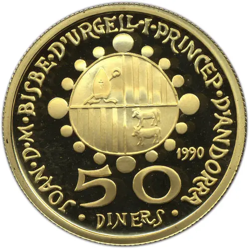 · JOAN · D · M · BISBE · D`URGELL · I · PRINCEP · D`ANDORRA · 1990 50 DINERS (Translation: Joan D.M. Bishop of Urgell and Prince of Andorra) |