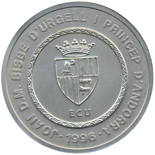JOAN D.M.BISBE D`URGELL I PRINCEP D`ANDORRA ECU · 1996 · (Translation: Joan D.M. Bishop of Urgell and Prince of Andorra) |