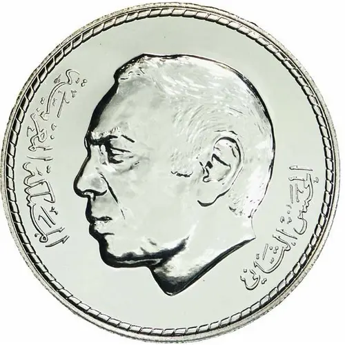 | Reverse description | Moroccan coat of arms between a oat sprig on the right and the profil of Moroccan coastline on the left. Dates are at both sides of the design; value is below |