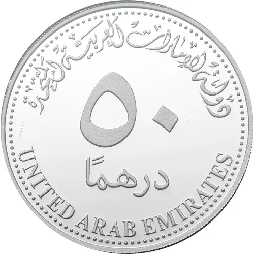 | Obverse lettering | دولة الإمارات العَربيّة المتّحدة ٥٠ درهماً UNITED ARAB EMIRATES (Translation: United Arab Emirates 50 Dirhams United Arab Emirates) |