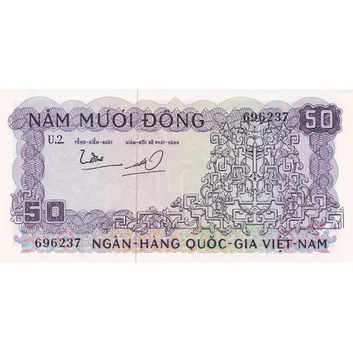 | 正面铭文 | NĂM MƯƠI ĐỒNG 50 TỔNG-KIỂM-SOÁT GIÁM-ĐỐC SỞ PHÁT-HÀNH 50 NGÂN-HÀNG QUỐC-GIA-VIỆT NAM (Translation: Fifty đồng. 50. Controller General. Director of the Issuing Department. 50. National Bank of the State of Vietnam.) |