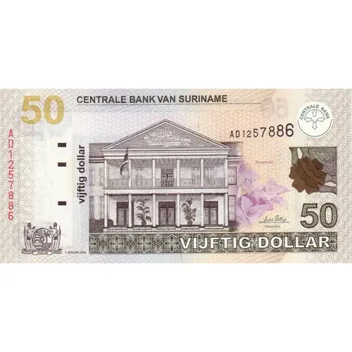(Translation: Central Bank of Suriname Fifty Dollars Bougainvillea Fifty Dollars May 1st., 2009)