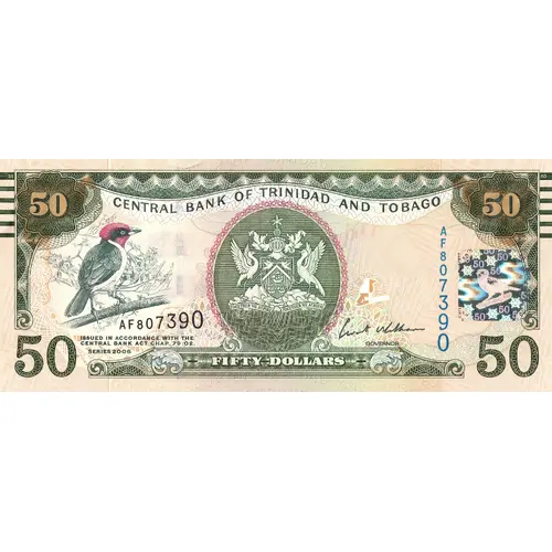 Obverse lettering CENTRAL BANK OF TRINIDAD AND TOBAGO ISSUED IN ACCORDANCE WITH THE CENTRAL BANK ACT CHAP. 79:02. SERIES 2006 FIFTY DOLLARS