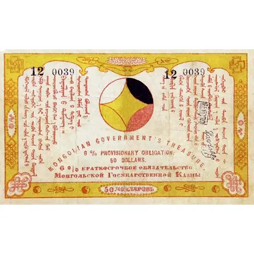 | Leyenda del anverso | ᠮᠣᠩᠭᠣᠯ ᠤᠯᠤᠰ ᠤᠨ ᠰᠠᠩ ᠠᠴᠠ ᠣᠯᠠᠨᠠ ᠡᠷᠭᠦᠭᠳᠡᠭᠰᠡᠨ ᠦ ᠠᠷᠪᠠᠨ ᠨᠢᠭᠡᠳᠦᠭᠡᠷ ᠣᠨ ᠠᠷᠪᠠᠨ ᠰᠠᠷᠠ ᠶᠢᠨ ᠬᠣᠷᠢᠨ ᠬᠦᠷᠲᠡᠯᠡ ᠬᠡᠮᠡᠬᠦ ᠬᠤᠭᠤᠴᠠᠭᠠ ᠪᠠᠷ ᠭᠠᠷᠭᠠᠭᠰᠠᠨ ᠪᠦᠭᠦᠳᠡ ᠨᠢᠭᠡᠨ ᠵᠠᠭᠤᠨ ᠬᠤᠪᠢ ᠠᠴᠠ ᠵᠢᠷᠭᠤᠭᠠᠨ ᠬᠤᠪ ᠤᠨ ᠬᠡᠦ ᠦᠷᠡᠵᠢᠭᠦᠯᠵᠦ ᠪᠦᠬᠦᠢ ᠪᠠᠭᠠ ᠪᠣᠯᠵᠣᠭᠠᠲᠤ ᠪᠠᠲᠤᠯᠠᠭᠠᠨ ᠤ ᠲᠡᠮᠳᠡᠭ᠃ ᠡᠨᠡᠬᠦ ᠪᠠᠲᠤᠯᠠᠭᠠᠨ ᠤ ᠲᠡᠮᠳᠡᠭ ᠢ ᠲᠤᠰᠢᠶᠠᠭᠰᠠᠨ ᠬᠦᠨᠳᠦ ᠤᠭ ᠲᠣᠭᠲᠠᠭᠰᠠᠨ ᠪᠣᠯᠵᠣᠭᠠ ᠰᠠᠩ ᠤᠨ ᠶᠠᠮᠤᠨ ᠠᠴᠠ ᠠᠷᠪᠠᠨ ᠶᠠᠩᠴᠢᠶᠠᠨ ᠤ ᠪᠡᠯᠡᠨ ᠮᠥᠩᠭᠥᠨ ᠦ ᠵᠦᠢᠯ ᠢ ᠭᠦᠢᠴᠡᠳᠭᠡᠨ ᠲᠥᠯᠮᠣᠢ᠃ ᠡᠭᠦᠨ ᠦ ᠲᠤᠯᠠ ᠭᠠᠷ ᠤᠨ ᠵᠢᠷᠤᠭ ᠲᠠᠯᠪᠢᠭᠰᠠᠨ ᠰᠠᠩ ᠤᠨ ᠶᠠᠮᠤᠨ ᠤ ᠲᠡᠷᠢᠭᠦᠨ ᠰᠠᠶᠢᠳ᠃ ᠰᠠᠩ ᠤᠨ ᠶᠠᠮᠤᠨ ᠤ ᠵᠦᠪᠳᠡᠬᠦ ᠲᠦᠰᠢᠮᠡᠯ᠃ ᠨᠡᠶᠢᠰᠯᠡᠯ ᠬᠦᠷᠢᠶᠡ᠃ ᠣᠯᠠᠨᠠ ᠡᠷᠭᠦᠭᠳᠡᠭᠰᠡᠨ ᠦ ᠠᠷᠪᠠᠨ ᠨᠢᠭᠡᠳᠦᠭᠡᠷ ᠣᠨ᠂ ᠳᠥᠷᠪᠡᠨ ᠰᠠᠷᠠ ᠶᠢᠨ ᠬᠣᠷᠢᠨ ᠅ MONGOLIAN GOVERNMENT`S TREASURE. 6 % PROVISIONARY OBLIGATION. 50 DOLLARS 6 % КРАТКОСРОЧНОЕ ОБЯЗАТЕЛЬСТВО МОНГОЛЬСКИЙ ГОСУДАРСТВЕННОЙ КАЗНЫ 50 ДОЛЛАРОВЪ (Translation: 6% short-term commitment to the Mongol State Treasure, 50 Dollars) |