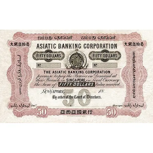 Obverse lettering ASIATIC BANKING CORPORATION FIFTY DOLLARS FIFTY DOLLARS THE ASIATIC BANKING CORPORATION promise to pay the bearer on demand at their branch in SINGAPORE in local currency the sum of FIFTY DOLLARS value received SINGAPORE By order of the Court of Directors
