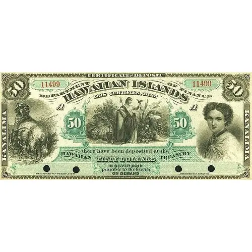 | Obverse lettering | CERTIFICATE OF DEPOSIT DEPARTMENT OF FINANCE HAWAIIAN ISLANDS THIS CERTIFIES THAT there have been deposited at the HAWAIIAN TREASURY FIFTY DOLLARS IN SILVER COIN payable to the bearer ON DEMAND |