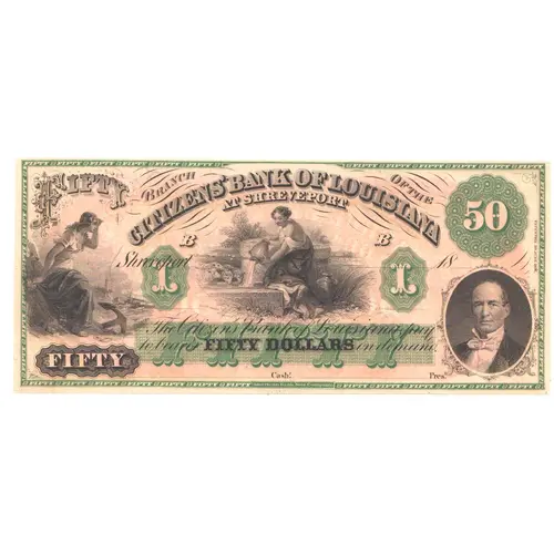 | Obverse lettering | BRANCH OF THE CITIZENS` BANK OF LOUISIANA AT SHREVEPORT Will Pay to bearer on demand FIFTY DOLLARS |