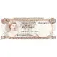 Brown print; yellow and pink underprint; black serial numbers. Bust of Queen Elizabeth II at left, head turned right, wearing George IV State Diadem. Watermark area at right. |