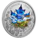 Several maple leaves in the breeze. In front a larger colored maple leaf with collage of (clockwise from top) the aurora borealis; the Canadian Rocky Mountains; a forest in autumn; Niagara Falls; the red cliffs of Prince Edward Island; wheat fields representing the Prairie Provinces; Arctic glaciers; and a quiet lake setting. The animals from Canada’s circulation coins (the caribou, beaver, polar bear and loon) are also depicted in their natural habitat. Bottom of the collage with wildflower: bunchberry (Cornus canadensis), fireweed (Chamerion angustifolium) and the western red lily (Lilium philadelphicum). |