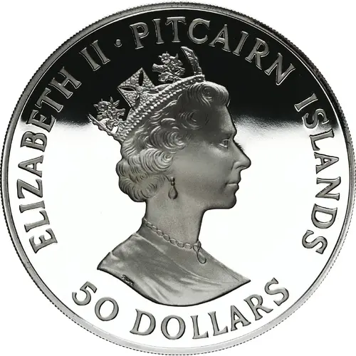 | Obverse lettering | ELIZABETH II · PITCAIRN ISLANDS RDM 50 DOLLARS |
