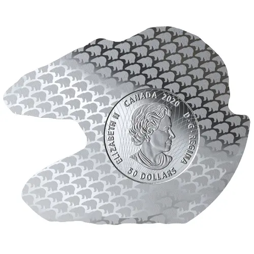 This coin has been specifically designed for consistent weight while also ensuring that the subject remains unaltered from the original in detail and proportions. From Brent Townsend`s 1996 2-dollar circulation coin reverse, a stylized adult polar bear stands on an ice floe, gazing out over the early summer Arctic landscape. The image is portrayed within its own silhouette. |