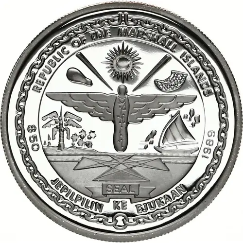 | Obverse lettering | REPUBLIC OF THE MARSHALL ISLANDS $50 JEPILPILIN KE EJUKAAN 1989 (Translation: Accomplishment Through Joint Effort) |
