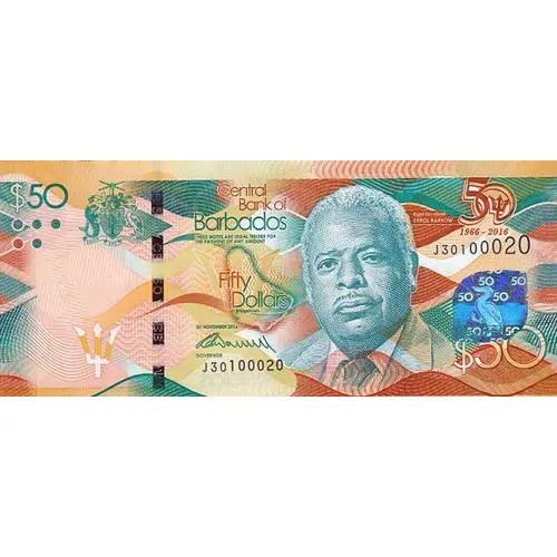 Central Bank of Barbados THESE NOTES ARE LEGAL TENDER FOR THE PAYMENT OF ANY AMOUNT Fifty Dollars Bridgetown 30 NOVEMBER 2016 GOVERNOR Right Excellent ERROL BARROW $50 PRIDE AND INDUSTRY 50 1966 - 2016 |