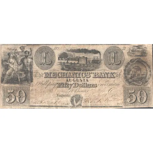 | Obverse lettering | L L STATE OF GEORGIA The MECHANICS` BANK of AUGUSTA Will pay Fifty Dollars on demand to__________ or bearer Augusta _____ 18__ 50 50 |