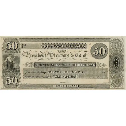 | Obverse lettering | 50 FIFTY DOLLARS 50 THE PRESIDENT, DIRECTORS & CO., OF THE NEW ENGLAND COMMERCIAL BANK promise to pay FIFTY DOLLARS to or bearer on demand NEWPORT____18___ New England Bank Note Co. 50 RHODE ISLAND |