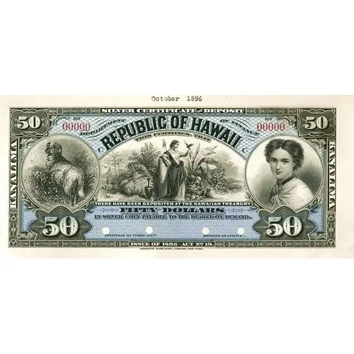 | Obverse lettering | SILVER CERTIFICATE OF DEPOSIT KANALIMA DEPARTMENT OF FINANCE REPUBLIC OF HAWAII THIS CERTIFIES, THAT THERE HAVE BEEN DEPOSITED AT THE HAWAIIAN TREASURY FIFTY DOLLARS IN SILVER COIN PAYABLE TO THE BEARER ON DEMAND. ISSUE OF 1895 - ACT № 19 |