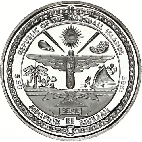 | Obverse lettering | REPUBLIC OF THE MARSHALL ISLANDS $50 JEPILPILIN KE EJUKAAN 1989 |