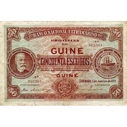 BANCO NACIONAL ULTRAMARINO PROVINCIA DE GUINÉ CINCOENTA ESCUDOS PAGAVEL NAS DEPENDENCIAS DA PROVINCIA DE GUINÉ LISBOA, 1 de Janeiro de 1921. BRADBURY, WILKINSON & & Co. Ld. GRAVADORES, LONDRES (Translation: National Bank Overseas Province of Guinea Fifty Escudos Payable at the premises of the Province of Guinea Lisbon, January 1st, 1921. Bradbury, Wilkinson & Co. Ltd. Engravers, London) |