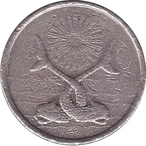 | Obverse description | Two fish with tails raised and interlaced with a stylized sun. |