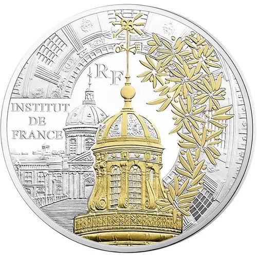 The face of this coin presents a view of the façade of the institute from the Pont des Arts. A laurel branch symbolizing the rich embroidery of the academicians` costume is also sublimated by a gold deposit. |