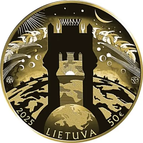 | Description de l’avers | The obverse of the coin features a fragment of a miniature copy of one of the most famous paintings by Mikalojus Konstantinas Čiurlionis, REX. It is as though the artist’s work is immortalised in gold. The fragment is framed by the inscription “Lietuva” (Lithuania), the denomination (€50), the year of issue (2025), as well as the mintmark of the Lithuanian Mint and the initials of the designer. |