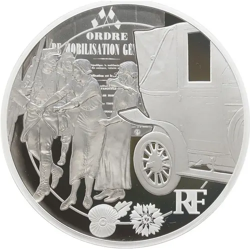 Reproduction of the general mobilization order with men in arms leaving for the front and saying goodbye. The back of a cab evokes the departure for the battle of the Marne. A poppy and cornflower evokes the French and Commonwealth soldiers engaged in the conflict. |