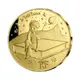 The Little Prince is sitting on the edge of his book. The background of the coin represents the planet on which the Little Prince finds himself as well as the stars and other planets. |