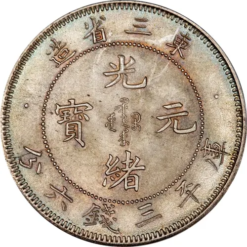造省三東 光 ᠪᠠᡩᠠᡵᠠᠩᡤᠠ 寶 ᠶᡠᠸᠠᠨ ᠪᠣᠣ 元 ᡩᠣᡵᠣ 緒 分六錢三平庫 (Translation: Made in the Three East Provinces Guangxu (Emperor) / Yuanbao (Original currency) Guangxu (Emperor) / Yuanbao (Original currency) Worth 3 Mace and 6 Candareens (weight)) |