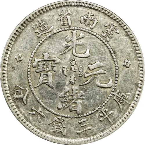 造省南雲 光 ᠪᠠᡩᠠᡵᠠᠩᡤᠠ 寶 ᠶᡠᠸᠠᠨ ᠪᠣᠣ 元 ᡩᠣᡵᠣ 緒 分六錢三平庫 (Translation: Made in Yunnan Province Guangxu (Emperor) / Yuanbao (Original currency) Guangxu (Emperor) / Yuanbao (Original currency) Worth 3 Mace and 6 Candareens (weight)) |