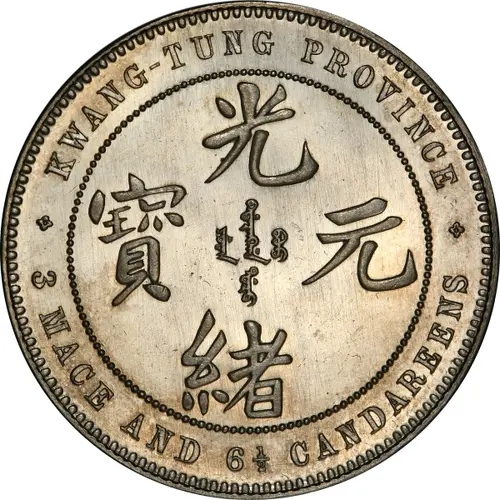 | Obverse lettering | KWANG-TUNG PROVINCE 光 ᠪᠠᡩᠠᡵᠠᠩᡤᠠ 寶 ᠶᡠᠸᠠᠨ ᠪᠣᠣ 元 ᡩᠣᡵᠣ 緒 3 MACE AND 6 1/2 CANDAREENS (Translation: Guangxu (Emperor) / Yuanbao (Original currency) Guangxu (Emperor) / Yuanbao (Original currency)) |