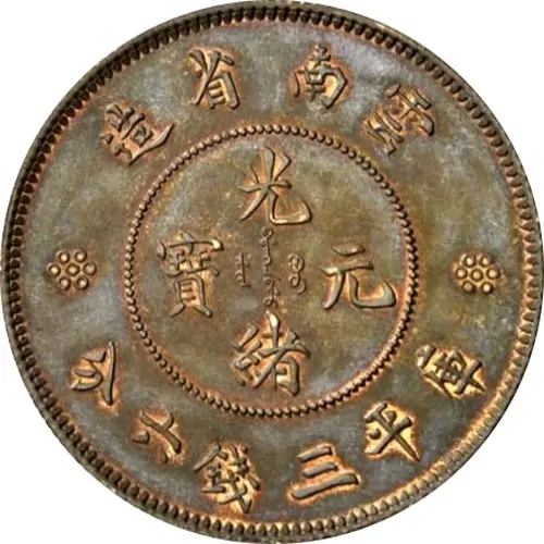 雲南省造 光 ᠪᠠᡩᠠᡵᠠᠩᡤᠠ 寶 ᠶᡠᠸᠠᠨ ᠪᠣᠣ 元 ᡩᠣᡵᠣ 緒 分六錢三平庫 (Translation: Made in Yunnan Province Guangxu (Emperor) / Yuanbao (Original currency) Guangxu (Emperor) / Yuanbao (Original currency) Worth 3 Mace and 6 Candareens (weight)) |