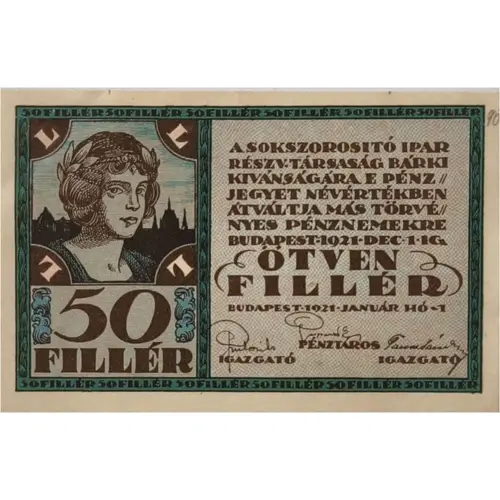 | 表面の銘文 | L - L - L - L - 50 FILLÉR A Sokszorosító Ipar Részvénytársaság bárki kívánságára e pénzjegyet névértékben átváltja más törvényes pénznemekre - Budapest, 1921. december hó 1-ig ÖTVEN FILLÉR Budapest 1921. január hó 1. |
