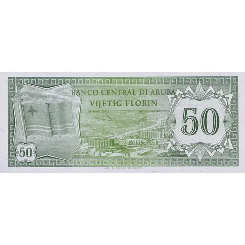 BANCO CENTRAL DI ARUBA VIJFTIG FLORIN 50 ARUBA JOH. ENSCHEDÉ EN ZONEN (Translation: Central Bank of Aruba Fifty Florin 50 Aruba Joh. Enschedé and Sons) |