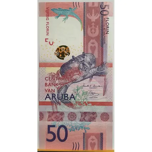 | Legenda rewersu | VIJFTIG FLORIN WETTIG BETAALMIDDEL 50 CENTRALE BANK VAN ARUBA 1 januari 2019 AUTEURSRECHT CENTRALE BANK VAN ARUBA © (Translation: Fifty Florin Legal Tender 50 Central Bank of Aruba January 1, 2019 Copyright Central Bank of Aruba ©) |