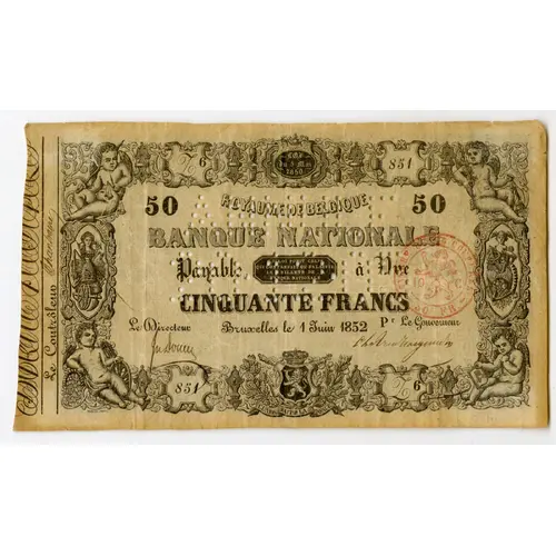(Translation: Law of May 5, 1850 Kingdom of Belgium National Bank Payable on sight Fifty Francs Brussels, June 1st., 1852)