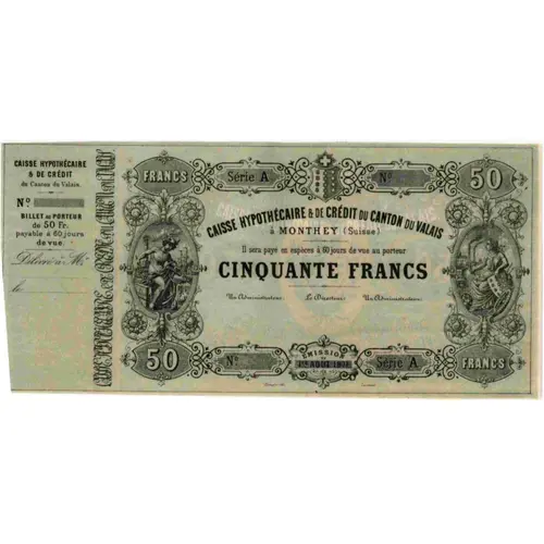 CAISSE HYPOTHÉCAIRE & DE CRÉDIT du Canton du Valais. No. BILLET AU PORTEUR de 50 Fr. payable à 60 jours de vue. Délivré à M. le FRANCS 50 CAISSE HYOPTHÉCAIRE & DE CRÉDIT DU CANTON DU VALAIS à MONTHEY Il sera payé en espèce à 60 jours de vue au porteur CINQUANTE FRANCS Un Administrateur: Le Directeur: Un Administrateur: 50 FRANCS EMISSION DU 1ER AOUT 1871 |