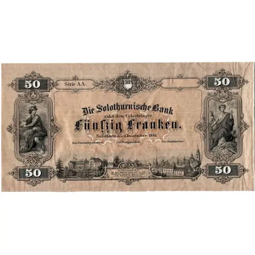 | Ön yüz lejandı | 50 50 Die Solothurnische Bank zahlt dem Ueberbringer Fünfzig Franken. Solothurn, den 1 Dezember 1881. Das Finanzdepartment. Der Bankpräsident. Der Bankdirector. 50 50 |