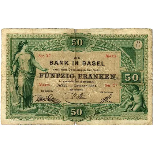 | Obverse lettering | 50 DIE BANK IN BASEL zahlt dem Überbringer, bei Sicht, FÜNFZIG FRANKEN 50 in gesetzlicher Barschaft. BASEL 1. Oktober 1893. DER PRÄSIDENT : DER KASSIER : DER DIREKTOR : 50 |