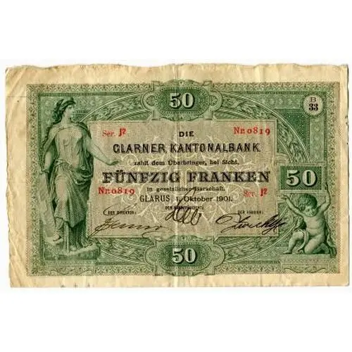 | Legenda del dritto | 50 DIE GLARNER KANTONALBANK zahlt dem Überbringer, bei Sicht, FÜNFZIG FRANKEN 50 in gesetzlicher Barschaft. GLARUS 1. OKTOBER 1901. DER DIREKTOR: DER BANKPRÄSIDENT: DER KASSIER: 50 |