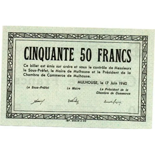 | Legenda do anverso | CINQUANTE 50 FRANCS Ce billet est émis sur ordre et sous le contrôle de Messieurs le Sous-Préfet, le Maire de Mulhouse et le Président de la Chambre de Commerce de Mulhouse. MULHOUSE, le 17 Juin 1940 |