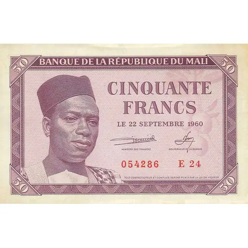 BANQUE DE LA RÉPUBLIQUE DU MALI CINQUANTE FRANCS LE 22 SEPTEMBRE 1960 TOUT CONTREFACTEUR ET COMPLICE SERONT PUNIS PAR LA LOI EN VIGUEUR (Translation: Bank of Republic of Mali Fifty Francs September 22th., 1960 Any counterfeiter and accomplice will be punished by applicable law) |