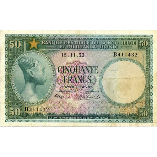 | Ön yüz lejandı | BANQUE CENTRALE DU CONGO BELGE ET DU RUANDA-URUNDI CINQUANTE FRANCS PAYBLES A VUE LE CONTREFACTEUR EST PUNI DE SERVITUDE PENALE |