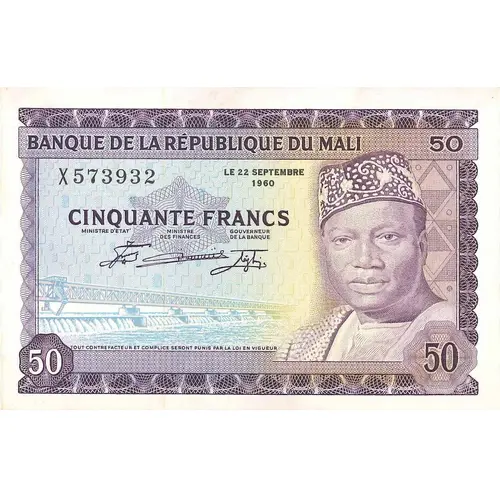 (Translation: Bank of Republic of Mali September 22th., 1960 Fifty Francs Any counterfeiter and accomplice will be punished by applicable law)