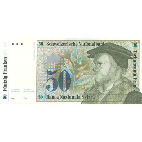 50 Fünfzig Franken Der Präsident des Bankrates Ein Mitglied des Direktoriums Konrad Gessner 1516-1565 50 50 Schweizerische Nationalbank 50 Banca Naziunala Svizra 50 Tschuncanta Francs |