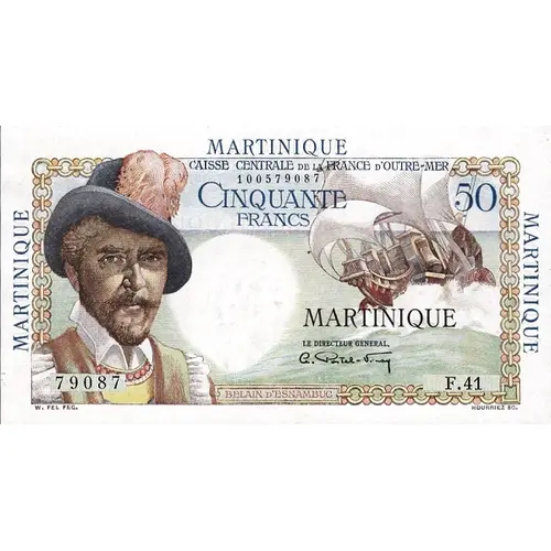 | Obverse lettering | MARTINIQUE CAISSE CENTRALE DE LA FRANCE D`OUTRE-MER 012623764 CINQUANTE FRANCS MARTINIQUE Le Directeur Général 23764 B.6 W. FEL. FEC. | HOURRIEZ SC. (Translation: Martinique Central Fund of Overseas France Fifty Francs Martinique) |