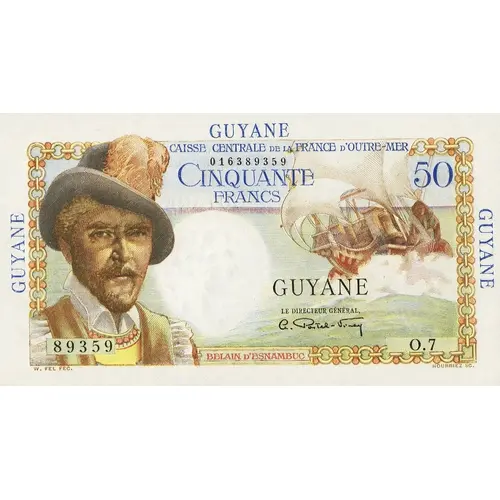 | Obverse lettering | GUYANE CAISSE CENTRALE DE LA FRANCE D`OUTRE-MER 50 CINQUANTE FRANCS GUYANE LE DIRECTEUR GENERAL, BELAIN D`ESNAMBUC W. FEL. FEC. HOURRIEZ SC. (Translation: Guiana Central Fund of Overseas France Fifty Francs Guiana Belain d`Esnambuc) |